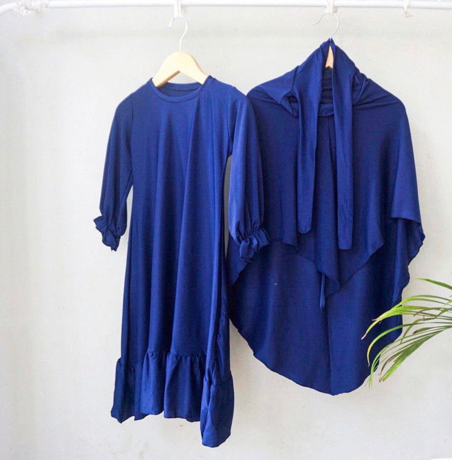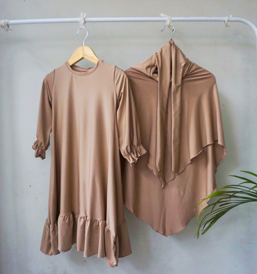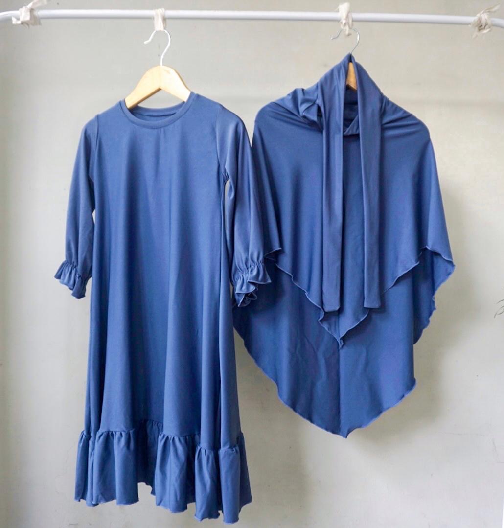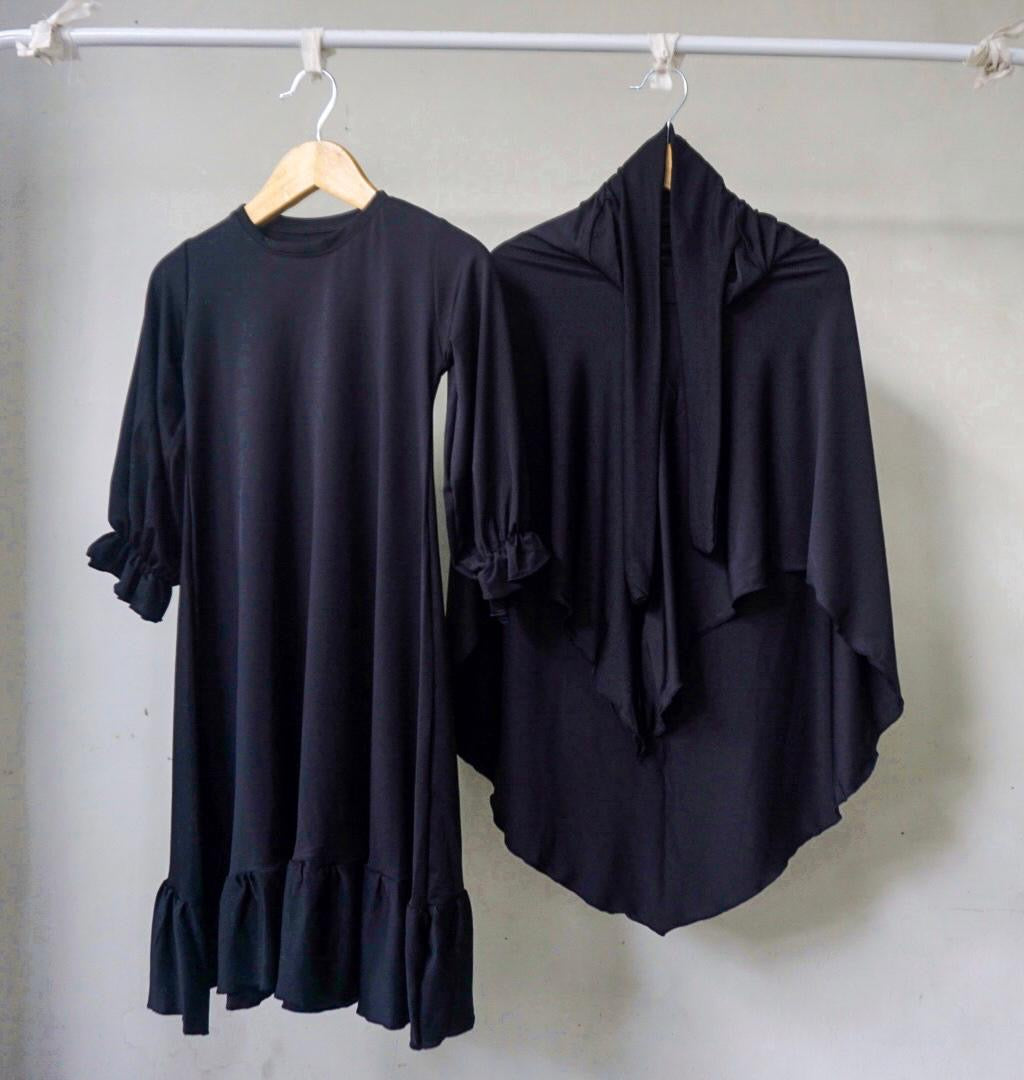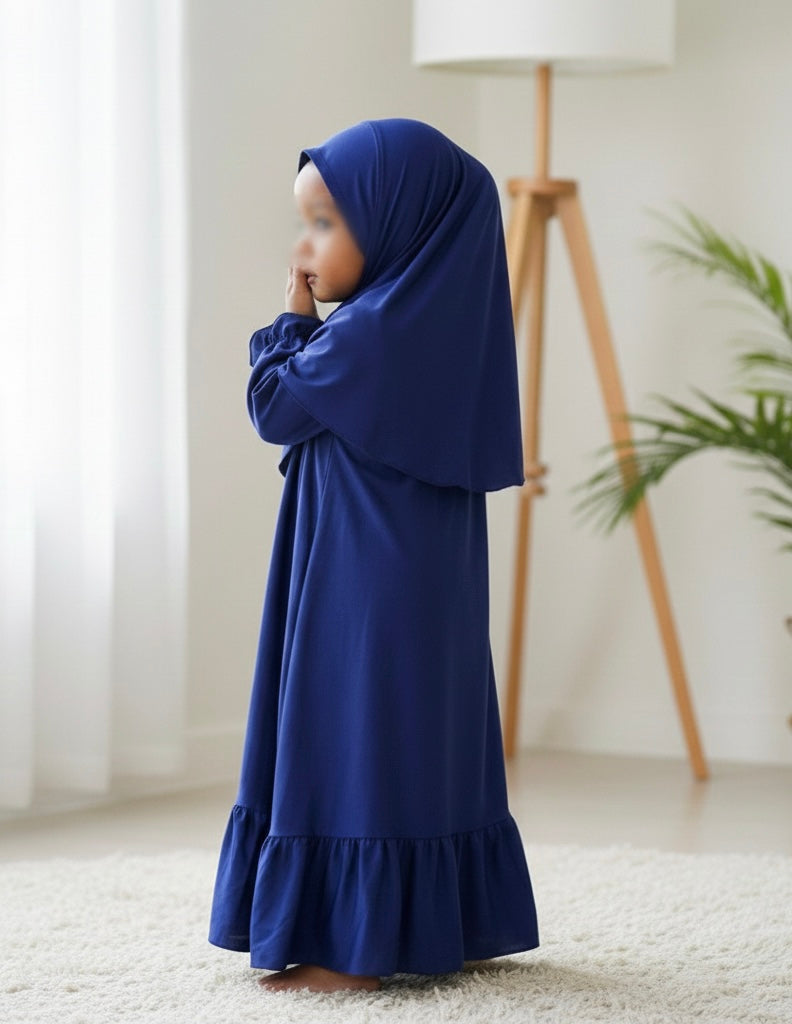 A beautiful Shaffiya baby set featuring an elegant ruffled dress and matching tied hijab. Designed with modesty and charm in mind, it’s the perfect stylish outfit for young girls.