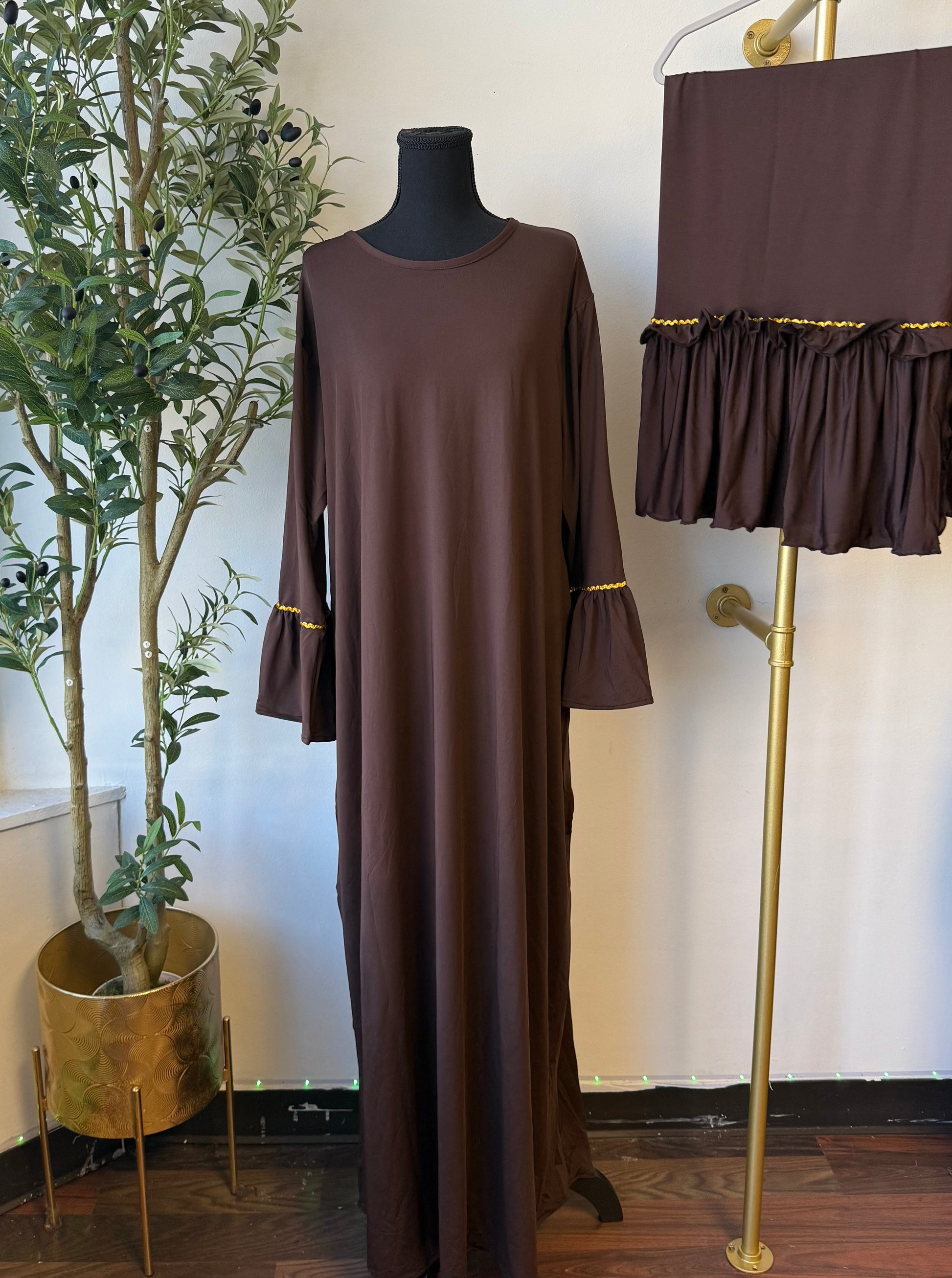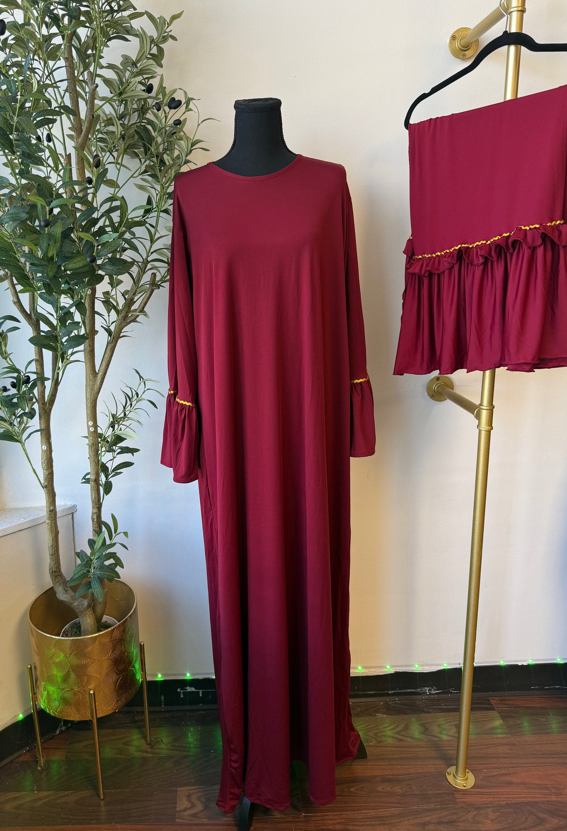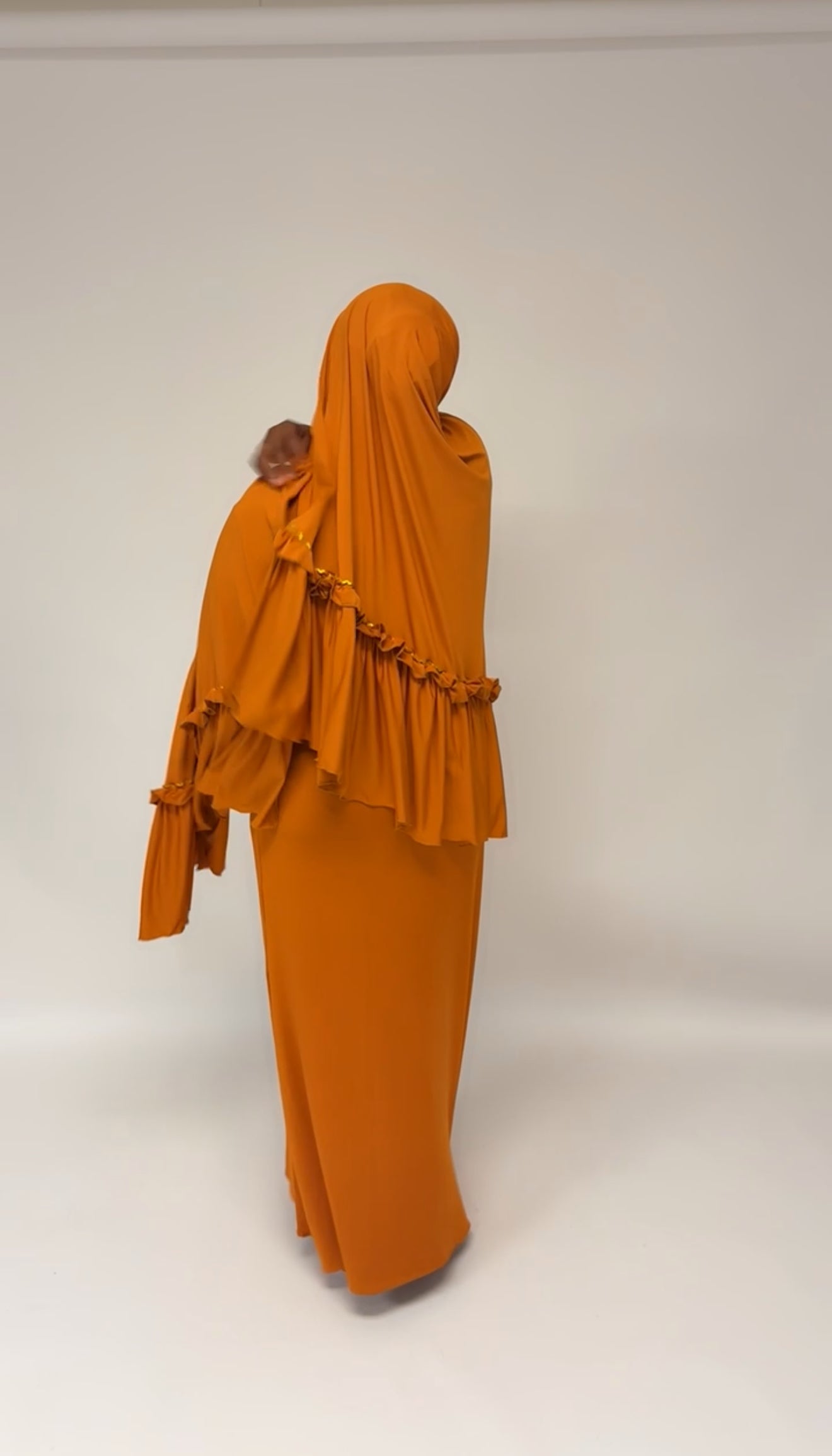 Our Sofia collection is inspired by autumn season. A long dress with ruffled sleeves comes with a matching scarf. Both include gold details. Perfect for any occasion.