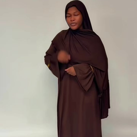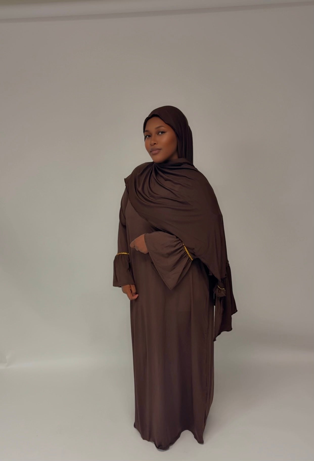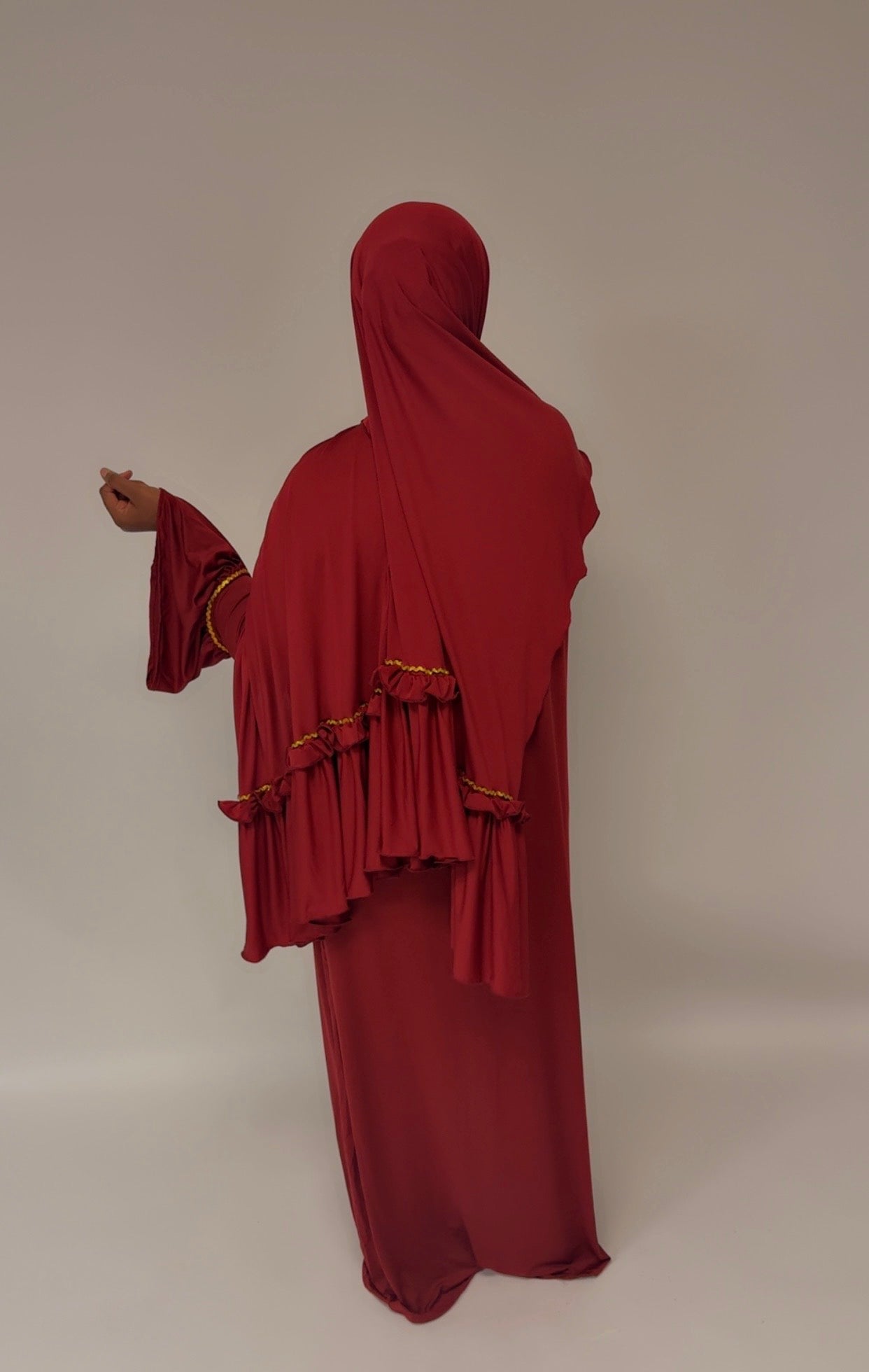 Our Sofia collection is inspired by autumn season. A long dress with ruffled sleeves comes with a matching scarf. Both include gold details. Perfect for any occasion.